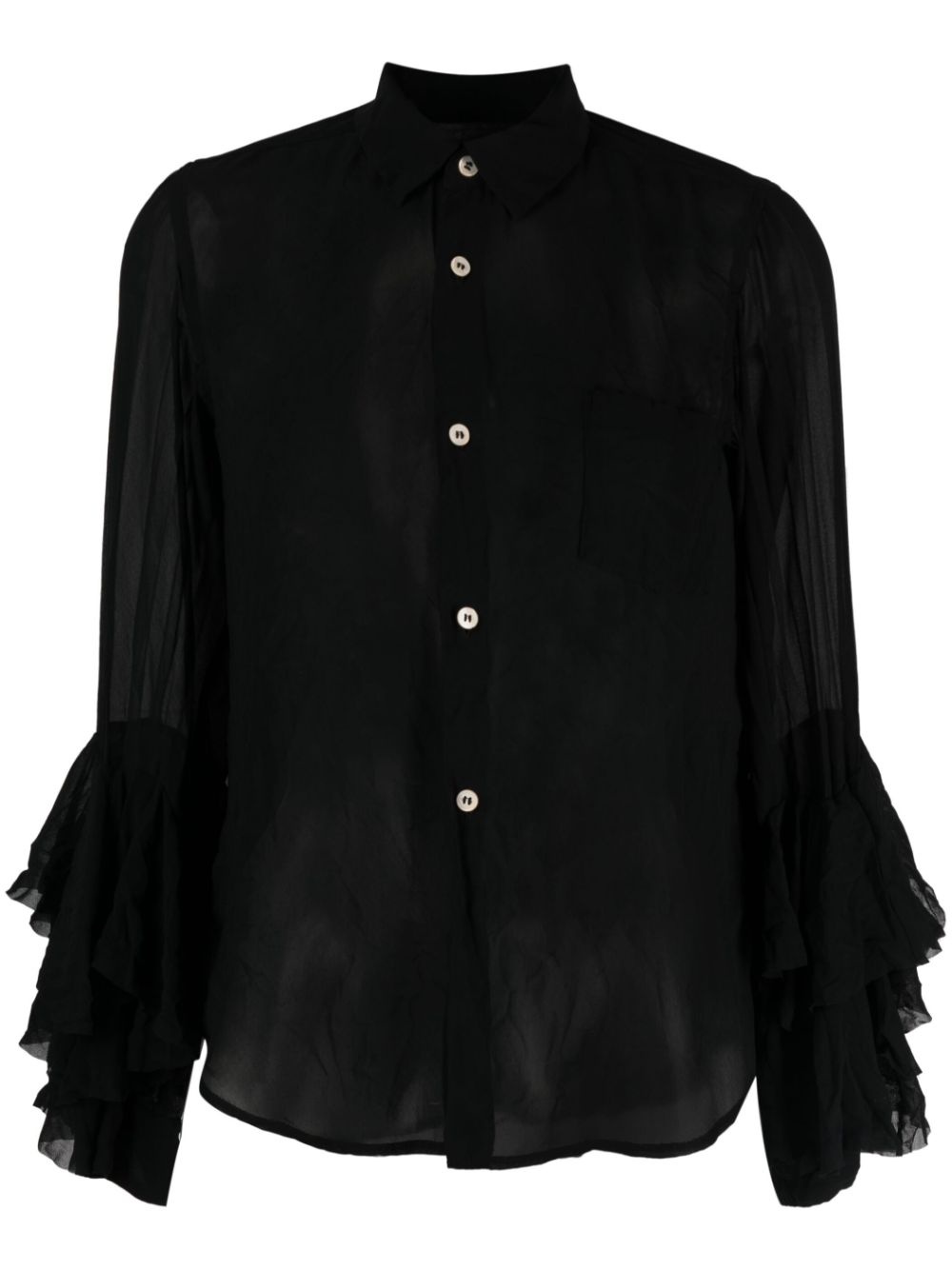 ruffle-detailed semi-sheer shirt Highlights - Black - Semi-sheer construction - Classic collar - Ruffle cuffs - Long sleeves - Front button fastening Imported Composition Polyester 100% SIZE & FIT Model measurements Height 5 ft 9 in(1.76 m) Bust/Chest 33.07 in(84 cm) Hips 34.64 in(88 cm) Waist 25.59 in(65 cm) FittingInformation Designed for a slim fit that sits just away from the body offering a close yet comfortable fit Made from a lightweight non-stretch fabric This piece fits true to size – take your usual size