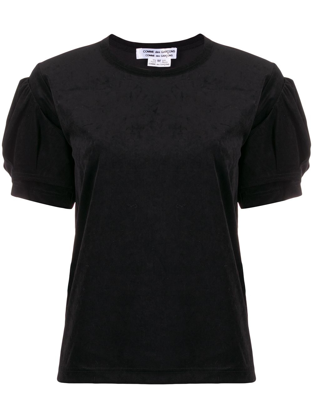 textured puff sleeve T-shirt Black textured puff sleeve T-shirt from Comme Des Garcons Comme Des Garcons featuring a textured style, a round neck, a straight hem and short puff sleeves. Imported Composition Triacetate 55%, Polyester 30%, Polyurethane 15% SIZE & FIT FittingInformation This piece fits true to size. We recommend you get your regular size Cut for a relaxed fit Made with a mid-weight fabric Washing instructions Hand Wash