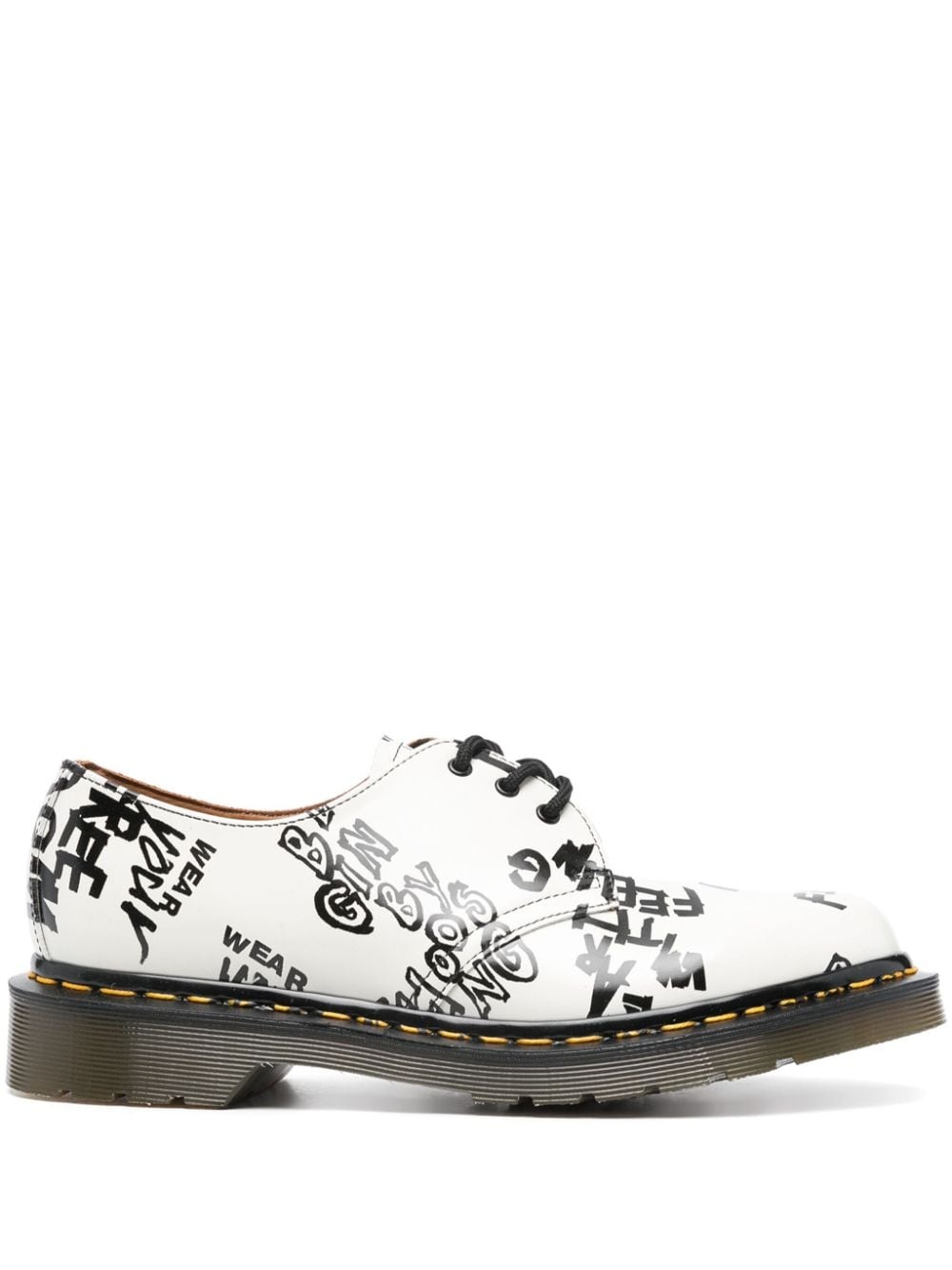 x Dr. Martens text-print Derby shoes Highlights - White/black - Calf leather - Brushed finish - All-over text print - Front lace-up fastening - Round toe - All-over signature contrast stitching - Rubber lug sole Made in United Kingdom Composition Leather 100% SIZE & FIT Measurement HEEL 1.37 in(3.5 cm) Sole height 0.78 in(2 cm)