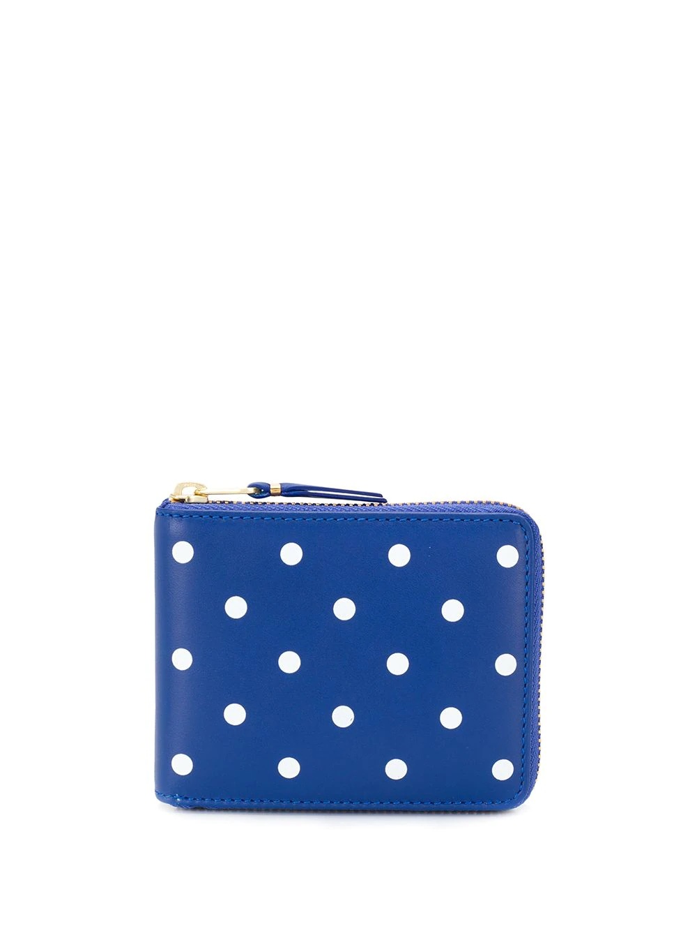 dotted pattern wallet Navy blue leather dotted pattern wallet from Comme Des Garcons Wallet featuring an all around zip fastening, multiple interior card slots, a coin pocket, multiple note compartments and gold-tone hardware. Imported Composition Outer: Calf Leather 100% SIZE & FIT Measurement DEPTH 0.78 in(2 cm) LENGTH 4.33 in(11 cm) WIDTH 3.54 in(9 cm)