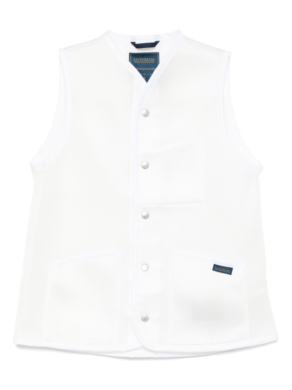 mesh gilet Highlights - White - Front press-stud fastening - Two front patch pockets - Sleeveless Made in United Kingdom Composition Polyester 100% Washing instructions Hand Wash