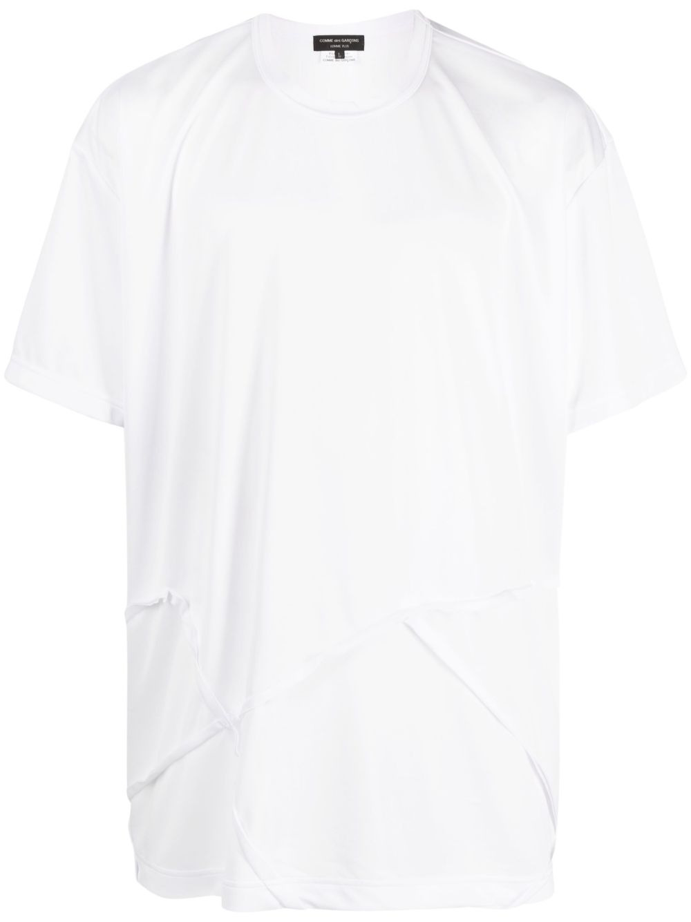 exposed-seam short-sleeve T-shirt chalk white satin finish exposed-seam detailing round neck short sleeves straight hem Imported Composition Polyester 100% SIZE & FIT Model measurements Height 6 ft 0 in(1.84 m) Bust/Chest 35.82 in(91 cm) Hips 37 in(94 cm) Waist 28.34 in(72 cm) Washing instructions Hand Wash