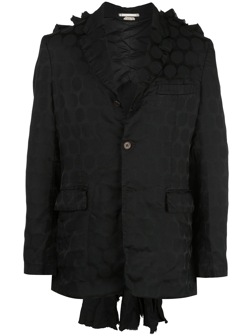 ruffle-detail blazer Highlights - Black - Tonal polka dot print - Ruffled detailing - Notched lapels - Chest welt pocket - Long sleeves - Front button fastening - Two side flap pockets - When buying this unisex item, keep in mind that it is graded in standard men's sizing. Imported Composition Polyester 100% SIZE & FIT Model measurements Height 6 ft 2 in(1.88 m) Bust/Chest 38.18 in(97 cm) Hips 37 in(94 cm) Waist 29.92 in(76 cm) Washing instructions Dry Clean Only