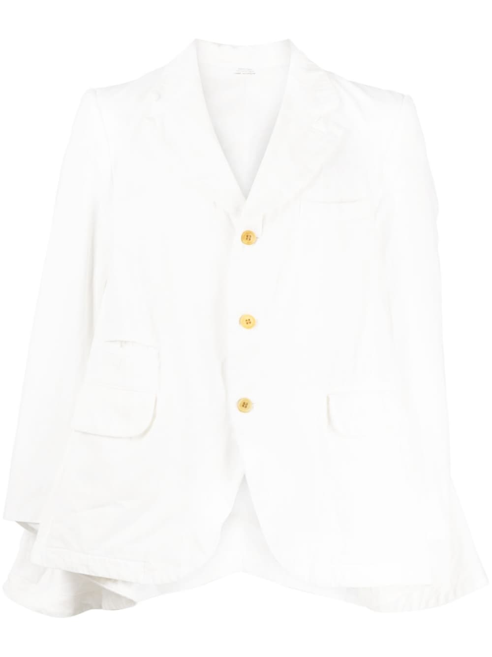 single-breasted blazer Highlights - Milk white - V-neck - Notched lapels - Front button fastening - Chest patch pocket - Two front flap pockets - Long sleeves - Buttoned cuffs - Straight hem Imported Composition Body: Polyester 66%, Cotton 24%, Linen/Flax 10% Lining: Polyester 100% SIZE & FIT Model measurements Height 6 ft 2 in(1.87 m) Bust/Chest 34.25 in(87 cm) Hips 36.22 in(92 cm) Waist 29.52 in(75 cm) FittingInformation Designed to be unstructured, offering a loose fit throughout Made from a midweight non-stretch fabric This piece fits true to size – take your usual size Washing instructions Machine Wash