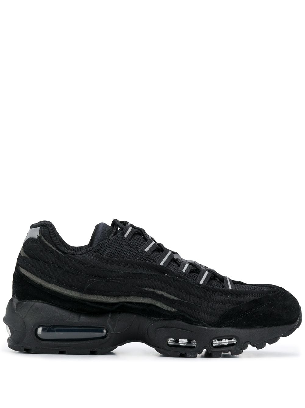 x Nike Air Max 95 sneakers Black leather x Nike Air Max 95 sneakers from Comme Des Garcons Homme Plus featuring raw edges, contrasting panels, a round toe, a lace-up front fastening, a logo patch at the tongue, branded heel counter and a signature Nike Air sole. Imported Composition Outer: Leather 100%, Fabric 100% Sole: Rubber 100% Lining: Fabric 100% SIZE & FIT Measurement HEEL 1.96 in(5 cm) Sole height 0.98 in(2.5 cm)