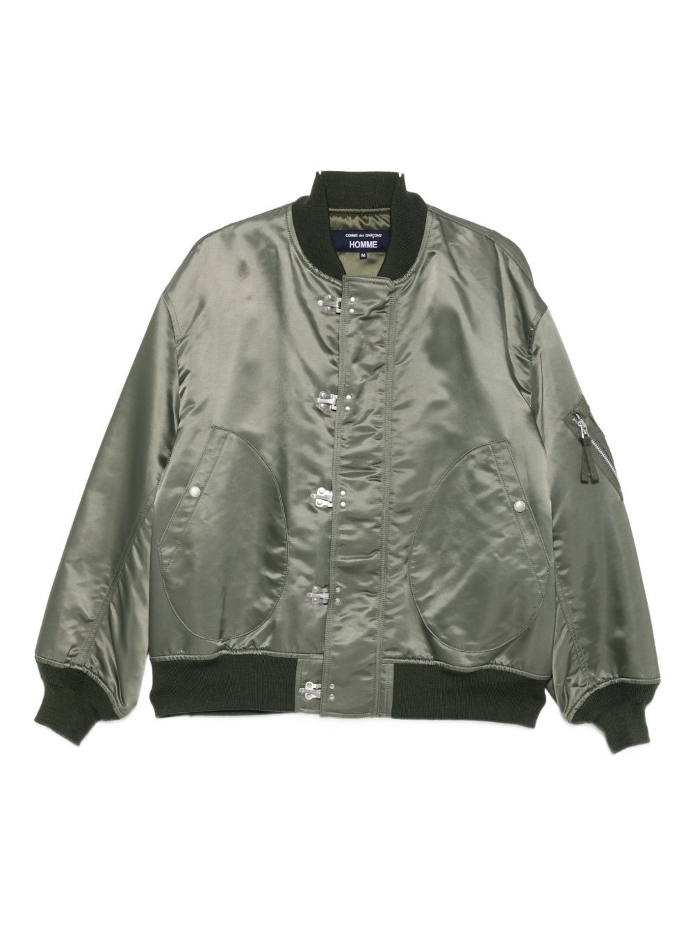 satin-finish bomber jacket Highlights - Khaki - Satin finish - Multiple buckles - Welt pockets - Ribbed hem - Two front pockets Imported Composition Fabric 100% Washing instructions Read Manufacturer Guidelines