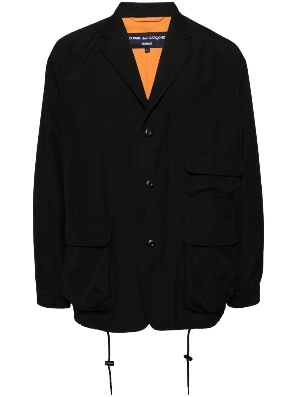 single-breasted blazer Highlights - Black - Wool blend - Notched lapels - Front button fastening - Front flap pocket - Drawstring hem - Long sleeves - Buttoned cuffs - Full lining - Internal pocket Imported Composition Outer: Wool 52%, Polyester 31%, Rayon 17% Lining: Wool 51%, Polyester 49% SIZE & FIT Model measurements Height 6 ft 2 in(1.87 m) Bust/Chest 33.07 in(84 cm) Hips 35.43 in(90 cm) Waist 26.77 in(68 cm) FittingInformation Designed for a relaxed fit, this piece allows for comfort and movement when worn The internal drawstring at the hem allows for fitted preferences Made from a midweight non-stretch fabric