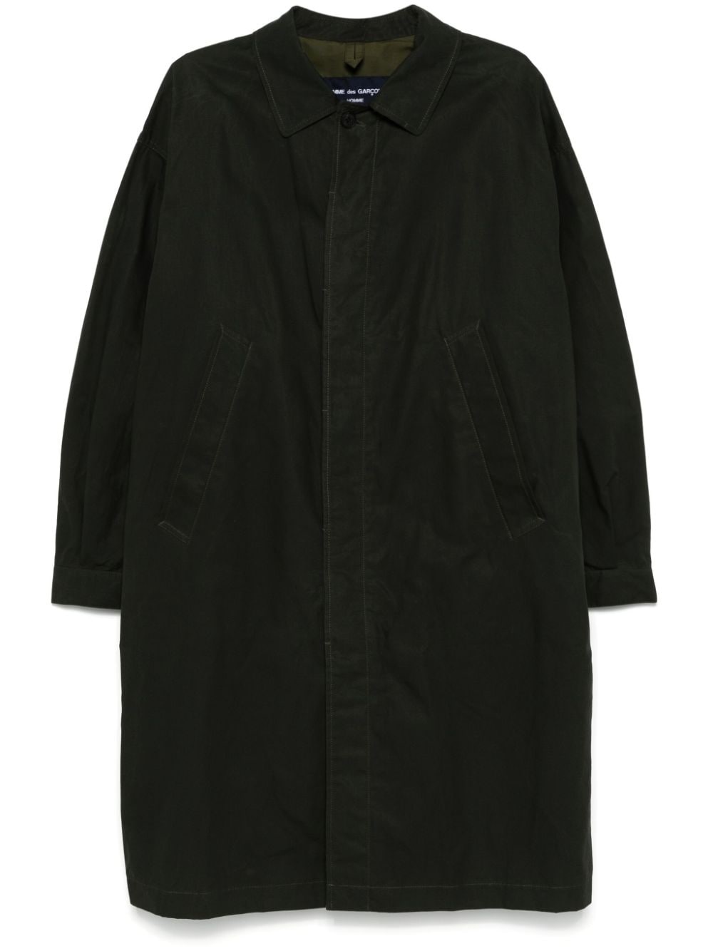 single-breasted coat Highlights - Khaki - Cotton - Concealed front button fastening - Classic collar - Drop shoulder - Long sleeves - Buttoned-cuff sleeves - Two side slit pockets - Central rear vent - Partial lining - Multiple internal slip pockets - Straight hem Made in United Kingdom Composition Outer: Cotton 100% Lining: Cotton 60%, Nylon 40%