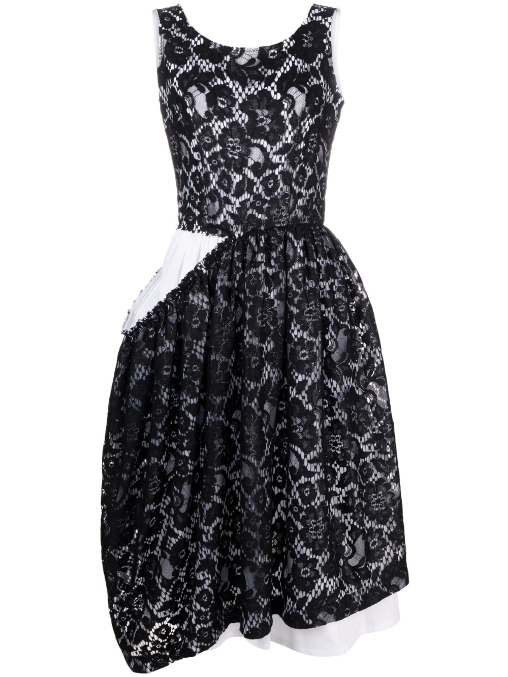 layered draped lace dress Comme des Garcons presents its play on textures and proportions for SS23. Crafted from white cotton poplin to a flared silhouette, this dress is overlaid with contrasting black lace to create a layered look. Highlights - White/black - Cotton - Lace overlay - Round neck - Sleeveless - Flared skirt - Mid-calf length Imported Composition Outer: Cotton 47%, Rayon 33%, Nylon 20% Lining: Cotton 100% SIZE & FIT Model measurements Height 5 ft 11 in(1.8 m) Bust/Chest 32.67 in(83 cm) Hips 36.22 in(92 cm) Waist 24.4 in(62 cm) FittingInformation Designed for a close fit at the chest and waist with a loose fit at the hip Made from a midweight non-stretch fabric This piece fits true to size – take your usual size