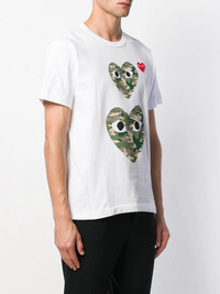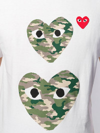 camouflage heart T-shirt The distinctive signature design of Rei Kawakubo’s almond-eyed heart print is an iconic trademark of the Comme Des Garcons Play brand. You can join the cult club too with this white cotton camouflage heart T-shirt featuring a round neck, short sleeves and a straight hem. Please note this item is unisex and sold in men's sizing. Imported Composition Cotton 100% SIZE & FIT Model measurements Height 6 ft 2 in(1.87 m) Bust/Chest 37.79 in(96 cm) Hips 37.79 in(96 cm) Waist 30.31 in(77 cm) FittingInformation This unisex piece runs small but is designed for a relaxed fit – take one size up Made from a midweight non-stretch fabric, this piece offers minimal elasticity when worn