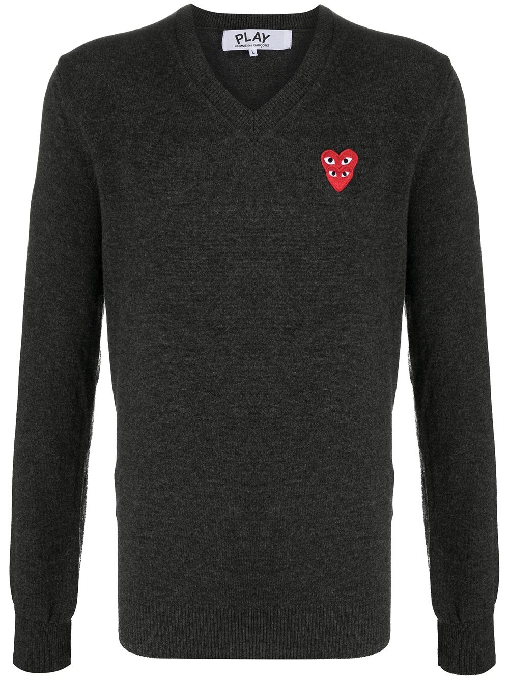 embroidered double heart patch jumper grey wool embroidered logo at the chest fine knit V-neck long sleeves ribbed cuffs ribbed hem Imported Composition Wool 100% SIZE & FIT Model measurements Height 6 ft 2 in(1.89 m) Bust/Chest 37.79 in(96 cm) Hips 37 in(94 cm) Waist 29.92 in(76 cm) FittingInformation This piece fits true to size. We recommend you get your regular size Cut for a relaxed fit Made with a mid-weight fabric Washing instructions Dry Clean Only