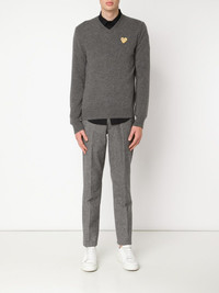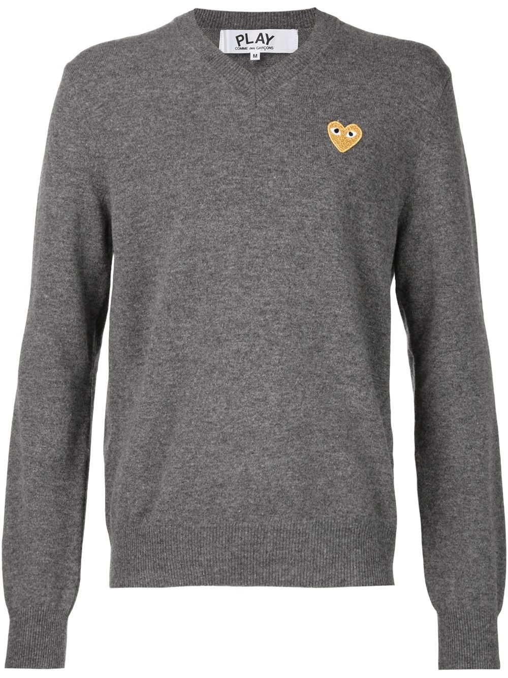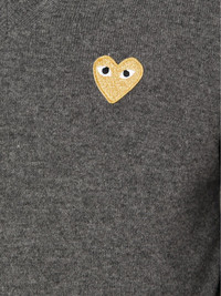 embroidered heart jumper Grey wool embroidered heart jumper from Comme Des Garcons Play. Imported Composition Wool 100% SIZE & FIT Model measurements Height 6 ft 2 in(1.88 m) Bust/Chest 35.82 in(91 cm) Hips 37 in(94 cm) Waist 29.92 in(76 cm) FittingInformation Designed for a relaxed fit, this piece allows for comfort and movement when worn Made from a midweight non-stretch fabric, this piece offers minimal elasticity when worn This piece fits small – take one size up