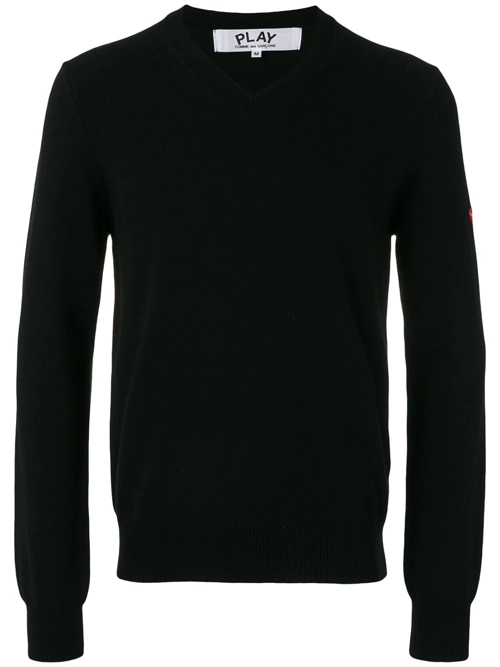 heart-patch sweater Highlights - Black wool embroidered heart patch sweatshirt from comme des garcons play featuring a v-neck, long sleeves, an embroidered heart patch detail to the left arm and a ribbed hem and cuffs. Imported Composition Wool 100% SIZE & FIT Model measurements Height 6 ft 2 in(1.89 m) Bust/Chest 34.64 in(88 cm) Hips 35.43 in(90 cm) Waist 27.55 in(70 cm) Washing instructions Dry Clean Only