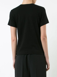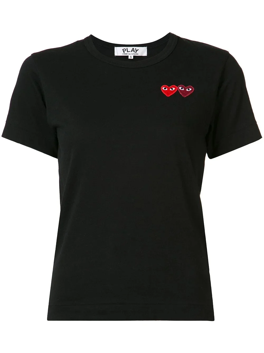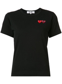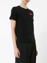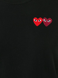 embroidered heart T-shirt This Comme Des Garcons Play T-shirt is double the fun with two individual red and dark red appliqued signature hearts animating the front of the top as they sit side-by-side. This black cotton staple piece from Comme Des Garcons Play also features a crew neck, short sleeves and a straight hem. Imported Composition Cotton 100% SIZE & FIT Model measurements Height 5 ft 10 in(1.79 m) Bust/Chest 31.1 in(79 cm) Hips 33.85 in(86 cm) Waist 22.83 in(58 cm) Measurement SLEEVE LENGTH 7.08 in(18 cm) LENGTH 22.44 in(57 cm) BUST 33.85 in(86 cm) Shoulder Width 13.77 in(35 cm) FittingInformation Designed for a relaxed fit, this piece allows for comfort and movement when worn Made from a midweight non-stretch fabric, this piece offers minimal elasticity when worn This piece fits small – take one size up Washing instructions Machine Wash