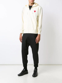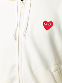embroidered zipped hoodie White embroidered zipped hoodie from Comme Des Garcons Play. Imported Composition Polyester 100% SIZE & FIT Model measurements Height 6 ft 4 in(1.92 m) Bust/Chest 33.85 in(86 cm) Hips 35.82 in(91 cm) Waist 29.92 in(76 cm) Measurement CHEST 46.45 in(118 cm) LENGTH 27.95 in(71 cm) SLEEVE LENGTH 24.4 in(62 cm) Shoulder Width 20.86 in(53 cm) FittingInformation Designed for a relaxed fit, this piece allows for comfort and movement when worn The ribbed hem offers a close, comfortable fit This piece fits small – take one size up Washing instructions Machine Wash