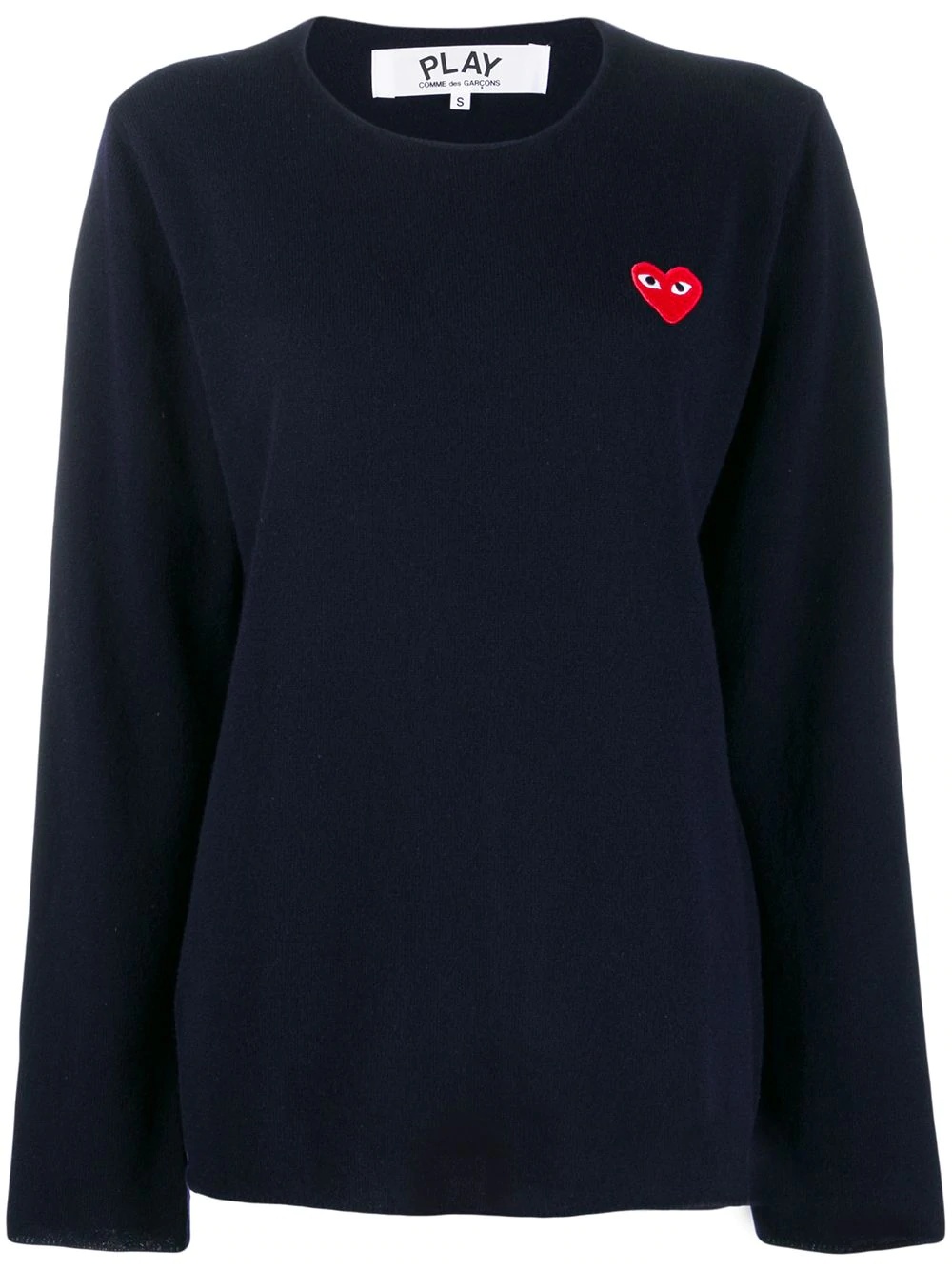 heart logo patch sweater 2 NAVY Wool or fine animal hair->Wool heart logo patch sweater from Comme Des Garcons Play. Imported Composition Wool 100% SIZE & FIT Model measurements Height 5 ft 11 in(1.8 m) Bust/Chest 31.49 in(80 cm) Hips 35.82 in(91 cm) Waist 24.8 in(63 cm) FittingInformation Designed for a relaxed fit, this piece allows for comfort and movement when worn Made with a midweight knit, this piece offers some stretch This piece fits small – take one size up Washing instructions Dry Clean Only