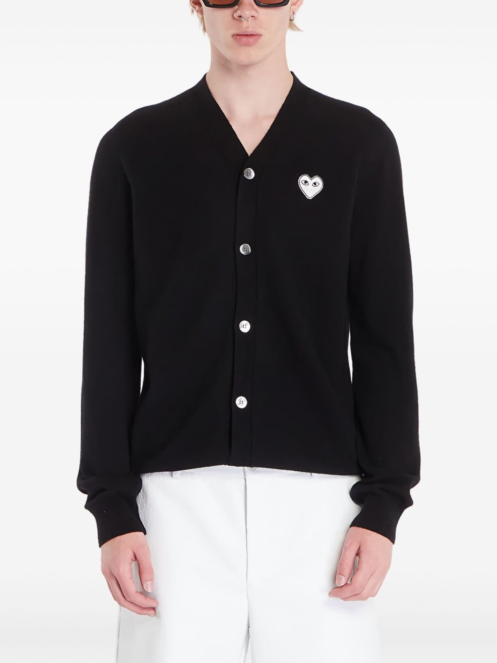 heart-patch wool cardigan Highlights - Black - Wool - Fine knit - Brushed finish - V-neck - Long sleeves - Signature heart patch - Ribbed cuffs and hem - Front button fastening - When buying this unisex item, keep in mind that it is graded in standard men's sizing. Imported Composition Wool 100%