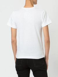 heart print T-shirt White cotton heart print T-shirt from Comme Des Garcons Play featuring a round neck, short sleeves, a printed logo to the front, a straight hem and a red heart patch at the chest. Made in Italy Composition Cotton 100% SIZE & FIT FittingInformation Designed for a relaxed fit, this piece allows for comfort and movement when worn Made from a midweight non-stretch fabric, this piece offers minimal elasticity when worn This piece fits small – take one size up Washing instructions Hand Wash