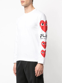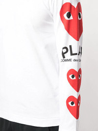 heart printed sleeves T-shirt White cotton heart printed sleeves T-shirt from Comme Des Garcons Play featuring a crew neck, long sleeves, a straight hem and a logo to the left arm. Imported Composition Outer: Cotton 100% SIZE & FIT Model measurements Height 6 ft 2 in(1.88 m) Bust/Chest 38.18 in(97 cm) Hips 37 in(94 cm) Waist 29.92 in(76 cm) Measurement CHEST 35.03 in(89 cm) Shoulder Width 16.92 in(43 cm) FittingInformation Designed for a relaxed fit, this piece allows for comfort and movement when worn Made from a midweight non-stretch fabric, this piece offers minimal elasticity when worn This piece fits small – take one size up Washing instructions Machine Wash