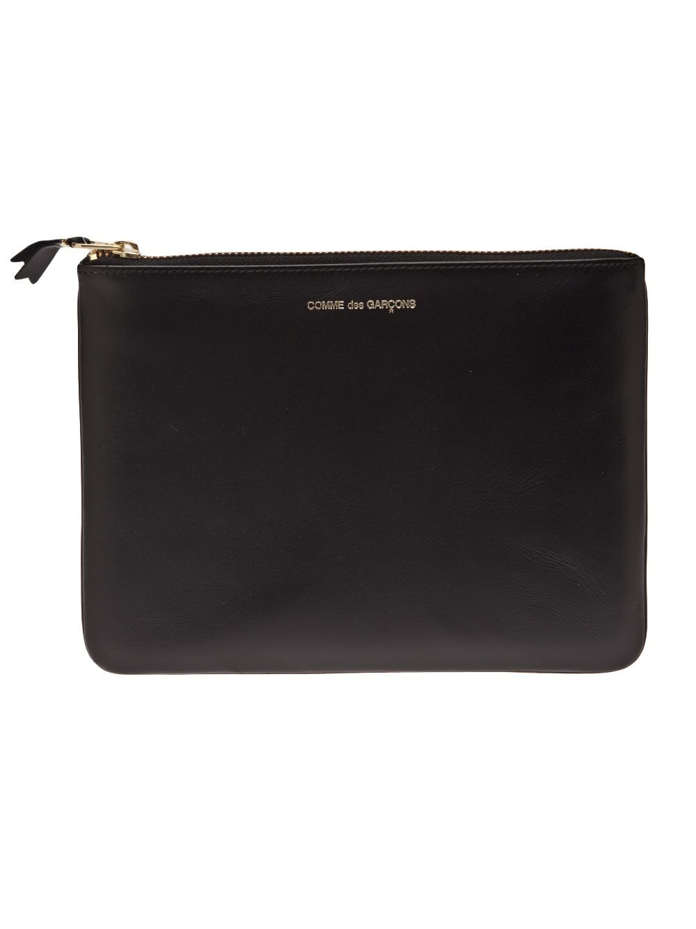 large basic wallet Black cowhide large basic wallet from Comme des Garcons Wallet featuring a top gold-tone zipper closure, and embossed gold exterior logo. Measure: 6" L x 8.5" W. Imported Composition Calf Leather 100%