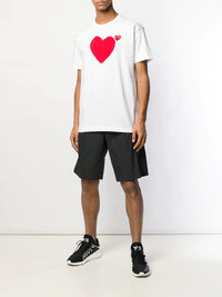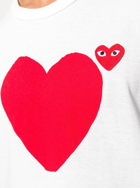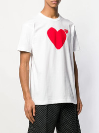 logo heart printed T-shirt White cotton logo heart printed T-shirt from Comme Des Garcons Play featuring a round neck with welt finishing, a print to the front, an embroidered brand patch at the chest and short sleeves. Imported Composition Cotton 100% SIZE & FIT Model measurements Height 6 ft 2 in(1.87 m) Bust/Chest 38.18 in(97 cm) Hips 36.61 in(93 cm) Waist 29.13 in(74 cm) Measurement Shoulder Width 16.14 in(41 cm) Washing instructions Hand Wash