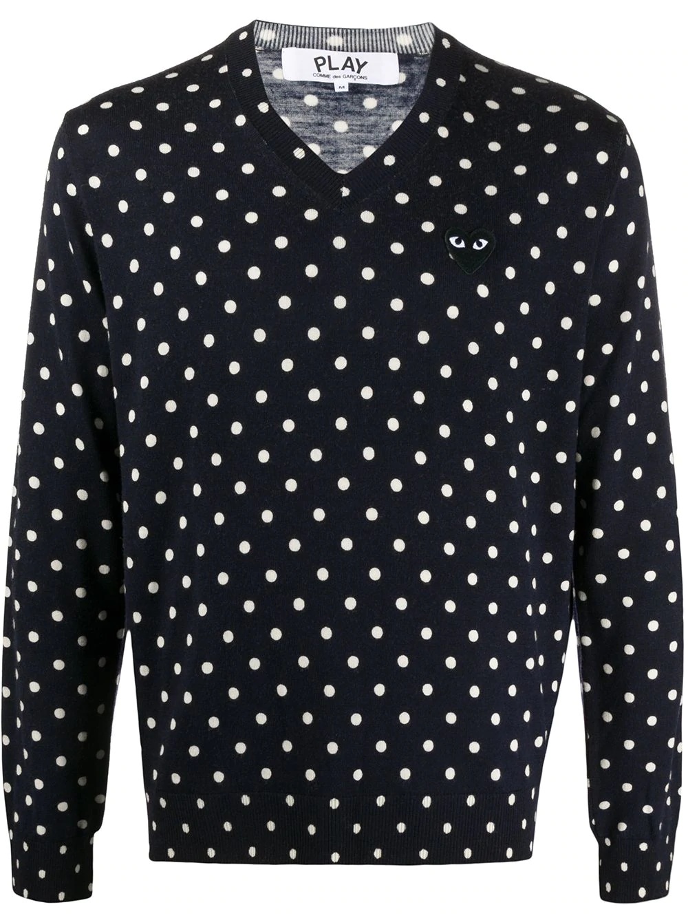 polka-dot print V-neck sweater Navy and white wool polka-dot print V-neck sweater from Comme Des Garcons Play featuring a knitted style, a polka dot pattern, a ribbed v-neck, long sleeves, a ribbed hem and cuffs and a logo to the chest. Imported Composition Wool 100% SIZE & FIT Model measurements Height 6 ft 2 in(1.88 m) Bust/Chest 36.61 in(93 cm) Hips 35.82 in(91 cm) Waist 27.95 in(71 cm) FittingInformation This piece fits true to size. We recommend you get your regular size Cut for a relaxed fit Made with a mid-weight fabric Washing instructions Dry Clean Only