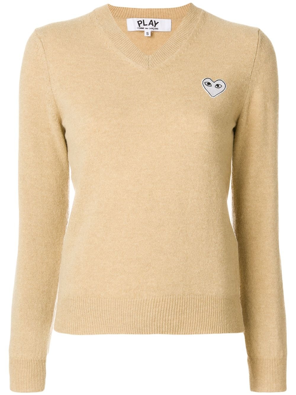 V-neck jumper Camel brown wool V-neck jumper from Comme Des Garcons Play. Imported Composition Wool 100% SIZE & FIT Model measurements Height 5 ft 10 in(1.77 m) Bust/Chest 32.28 in(82 cm) Hips 35.82 in(91 cm) Waist 24.8 in(63 cm) Measurement BUST 30 in(76.2 cm) LENGTH 20.51 in(52.1 cm) WAIST 29.01 in(73.7 cm) SLEEVE LENGTH 20.98 in(53.3 cm) Washing instructions Dry Clean Only
