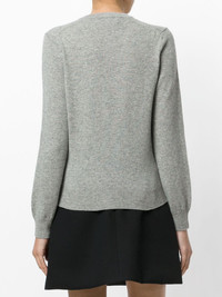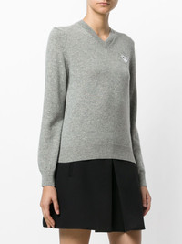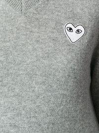 V-neck pullover Grey wool V-neck pullover from Comme Des Garcons Play. Imported Composition Wool 100% SIZE & FIT Model measurements Height 5 ft 10 in(1.77 m) Bust/Chest 32.67 in(83 cm) Hips 35.03 in(89 cm) Waist 24.4 in(62 cm) Measurement BUST 30 in(76.2 cm) LENGTH 20.51 in(52.1 cm) WAIST 29.01 in(73.7 cm) SLEEVE LENGTH 20.98 in(53.3 cm) Washing instructions Dry Clean Only