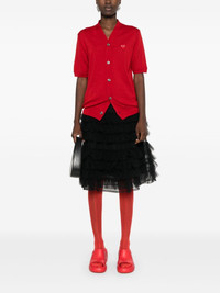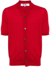 V-neck wool cardigan Highlights - Rose red - Wool - Knitted construction - Signature heart patch - Ribbed v-neck - Front button fastening - Short sleeves - Ribbed cuffs and hem - When buying this unisex item, keep in mind that it is graded in standard men's sizing. Imported Composition Wool 100% SIZE & FIT Model measurements Height 5 ft 11 in(1.8 m) Bust/Chest 32.67 in(83 cm) Hips 36.22 in(92 cm) Waist 24.4 in(62 cm) FittingInformation This unisex piece is designed for a relaxed fit whether you usually select women's or men's sizes The ribbed hem offers a close, comfortable fit Made with a midweight knit, this piece offers some stretch