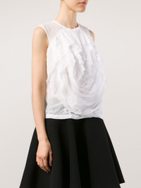 ruffled front top White ruffled front top from Comme Des Garcons. Imported Composition Polyester 100% SIZE & FIT Model measurements Height 5 ft 9 in(1.75 m) Bust/Chest 31.1 in(79 cm) Hips 35.03 in(89 cm) Waist 22.83 in(58 cm)