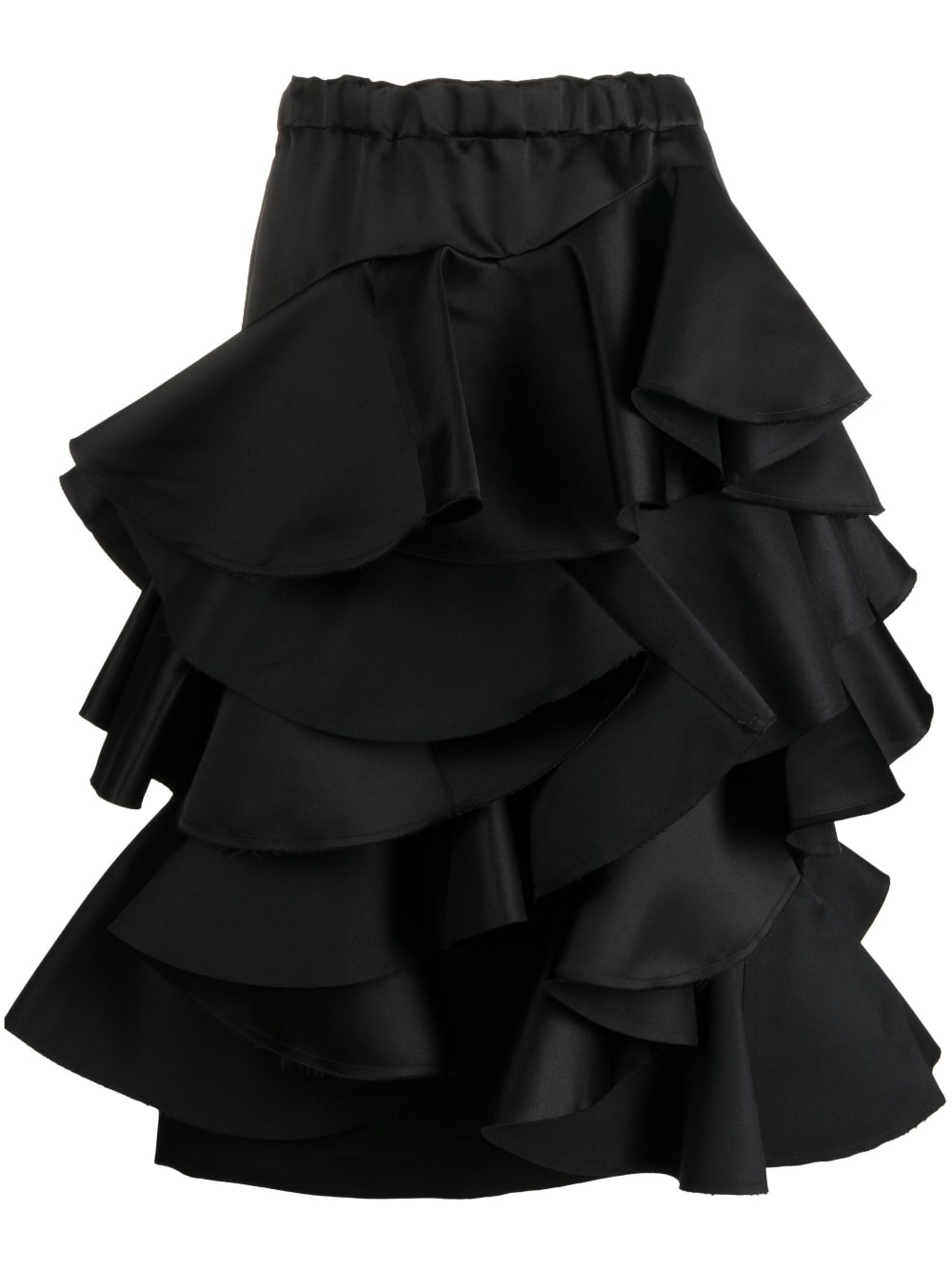 ruffled tiered midi skirt Defined by cascading layers of ruffles, this midi skirt from Comme Des Garcons is emblematic of the brand’s penchant for voluminous silhouettes. Highlights - Black - Satin weave - Ruffled detailing - Mid-rise - Elasticated waistband - Tiered skirt - Below-knee length Imported Composition Polyester 100% SIZE & FIT Model measurements Height 5 ft 10 in(1.79 m) Bust/Chest 31.49 in(80 cm) Hips 35.03 in(89 cm) Waist 23.62 in(60 cm) Washing instructions Dry Clean Only