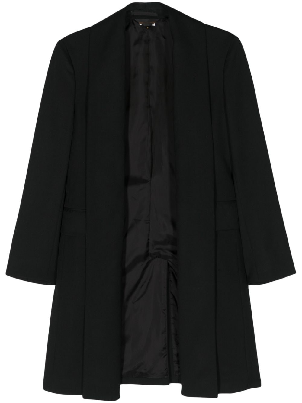 shawl-lapel wool bazer Highlights - Black - Wool - Twill weave - Shawl lapels - Open front - Shoulder pads - Long sleeves - Buttoned cuffs - American rear vent - Straight hem - Two front flap pockets Imported Composition Lining: Cupro 100%, Nylon 100%, Polyester 100% Outer: Wool 100%