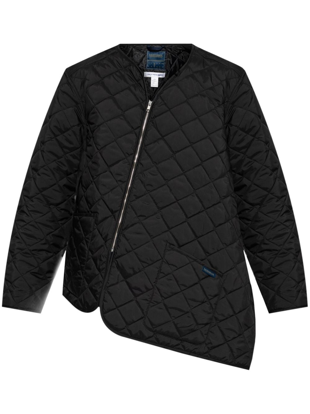 asymmetric jacket Highlights - Black - Textured finish - Diamond-quilted detailing - Front zip fastening - V-neck - Long sleeves - Two side patch pockets - Asymmetric hem Made in United Kingdom Composition Polyester 100% SIZE & FIT FittingInformation Designed to be unstructured, offering a loose fit throughout Made from a quilted non-stretch fabric, giving it no natural elasticity