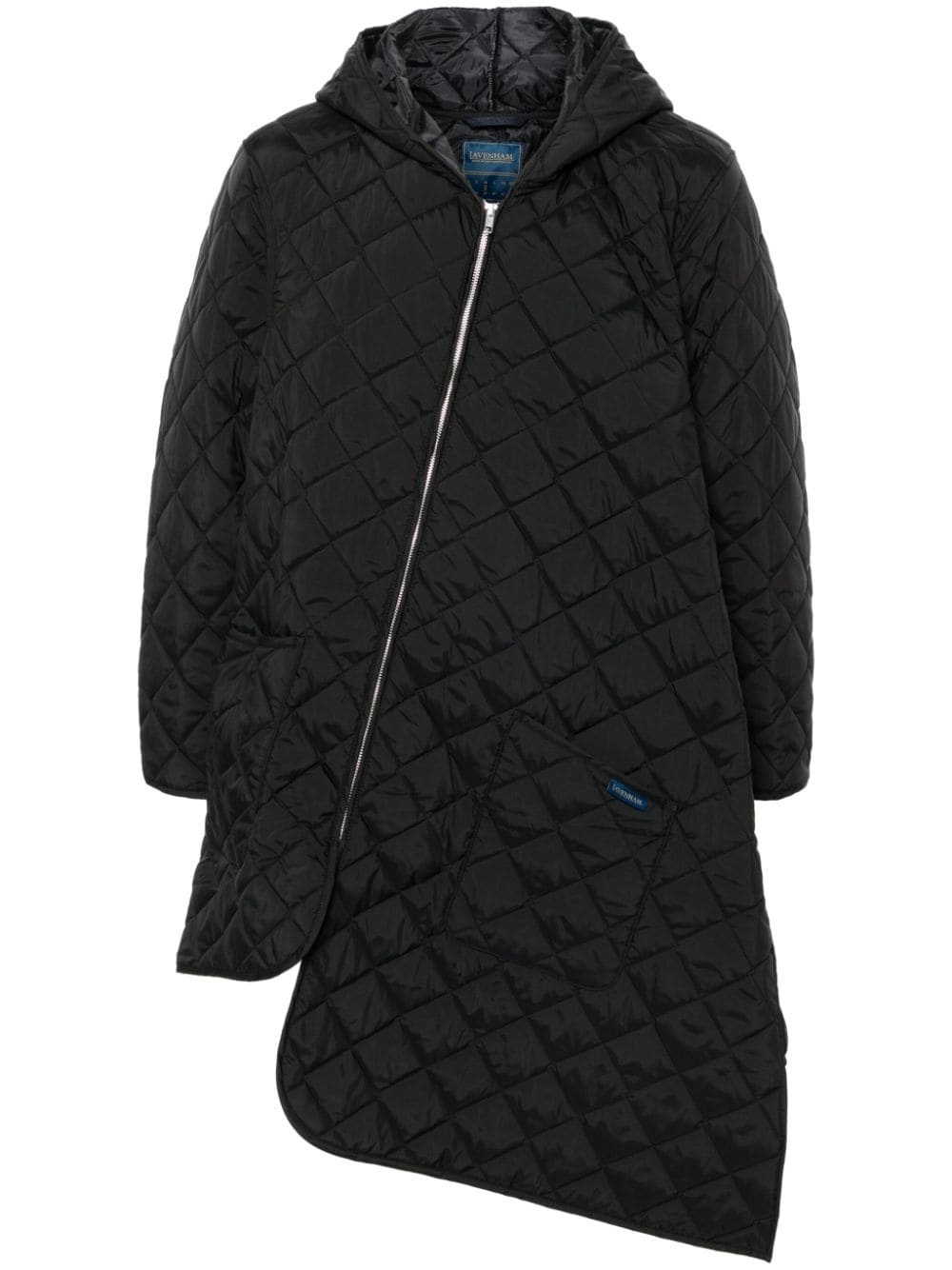 asymmetric parka coat Highlights - Black - Off-centre front zip fastening - Diamond quilting - Classic hood - Long sleeves - Logo patch to the side - Two side patch pockets - Full lining - Asymmetric hem - Mid-length Made in United Kingdom Composition Outer: Polyester 100% Lining: Polyester 100% SIZE & FIT Model measurements Height 6 ft 1 in(1.85 m) Bust/Chest 35.82 in(91 cm) Hips 37.79 in(96 cm) Waist 29.13 in(74 cm) FittingInformation Designed to be unstructured, offering a loose fit throughout Made from a quilted non-stretch fabric, giving it no natural elasticity