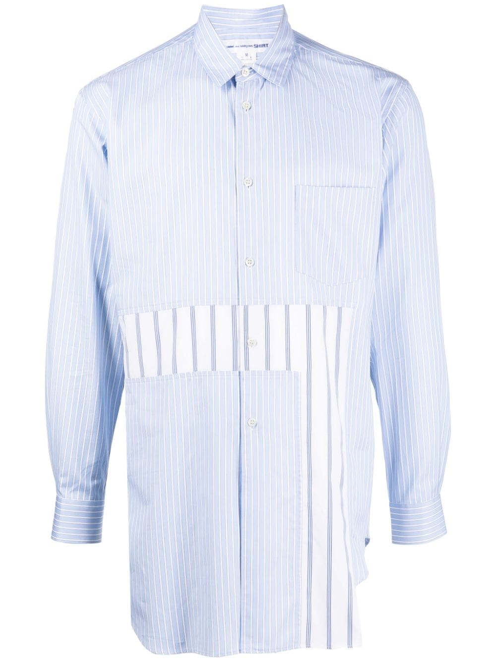 asymmetric striped panelled cotton shirt Highlights - Light blue/white - Cotton - Panelled design - Multi-way stripe pattern - Classic collar - Front button fastening - Long sleeves - Buttoned cuffs - Asymmetric hem Made in France Composition Cotton 100% SIZE & FIT Model measurements Height 6 ft 2 in(1.89 m) Bust/Chest 37.4 in(95 cm) Hips 36.61 in(93 cm) Waist 28.34 in(72 cm) Measurement CHEST 40.94 in(104 cm) SLEEVE LENGTH 23.62 in(60 cm) Shoulder Width 18.5 in(47 cm) LENGTH 29.52 in(75 cm) WAIST 39.37 in(100 cm) FittingInformation Designed to be unstructured, offering a loose fit throughout Made from a midweight non-stretch fabric This piece fits true to size – take your usual size Washing instructions Machine Wash