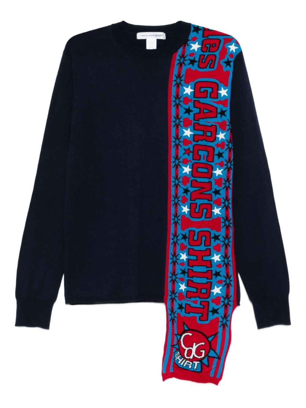 attached-scarf sweater Highlights - Navy blue - Attached scarf detail - Red-blue-white pattern - Lettering detail - Crew neck Imported Composition Acrylic 54%, Wool 25%, Nylon 21% SIZE & FIT Model measurements Height 6 ft 0 in(1.84 m) Bust/Chest 35.82 in(91 cm) Hips 37 in(94 cm) Waist 28.34 in(72 cm) Washing instructions Read Manufacturer Guidelines