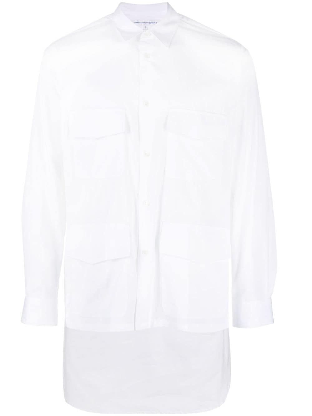 cargo cotton shirt Highlights - White - Cotton - Poplin texture - Classic collar - Front button fastening - Drop shoulder - Long sleeves - Buttoned cuffs - Multiple cargo pockets - Short side slits - High-low hem Made in France Composition Cotton 100% SIZE & FIT Model measurements Height 6 ft 2 in(1.87 m) Bust/Chest 38.18 in(97 cm) Hips 36.61 in(93 cm) Waist 29.13 in(74 cm) FittingInformation Designed for a relaxed fit, this piece allows for comfort and movement when worn Made from a midweight non-stretch fabric This piece fits true to size – take your usual size