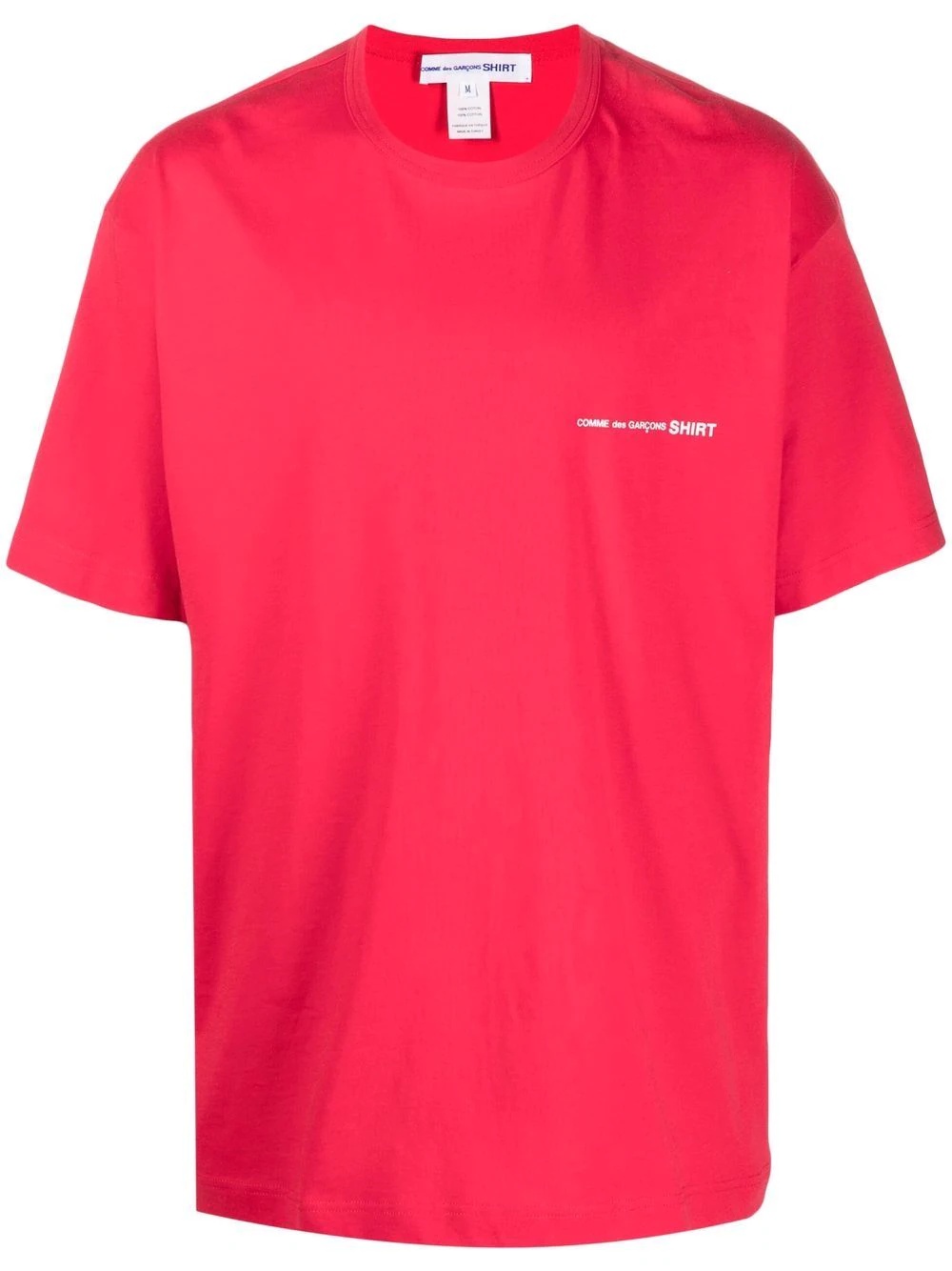 chest logo-print T-shirt This T-shirt from Comme Des Garcons Shirt is solely adorned with a logo print on the chest. This results in a minimal design whose clean, slight-oversized cut takes centre stage. Highlights - Bright red/white - Cotton - Logo print at the chest - Round neck - Short sleeves - Straight hem Imported Composition Cotton 100% SIZE & FIT Model measurements Height 6 ft 2 in(1.89 m) Bust/Chest 36.22 in(92 cm) Hips 35.82 in(91 cm) Waist 28.74 in(73 cm) Measurement CHEST 50 in(127 cm) SLEEVE LENGTH 10 in(25.4 cm) Shoulder Width 22 in(55.9 cm) LENGTH 30.98 in(78.7 cm) WAIST 50 in(127 cm) FittingInformation This piece fits true to size. We recommend you get your regular size Cut for a loose fit Made with a mid-weight fabric Washing instructions Machine Wash