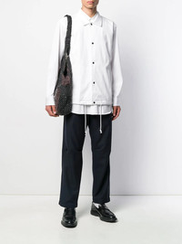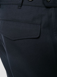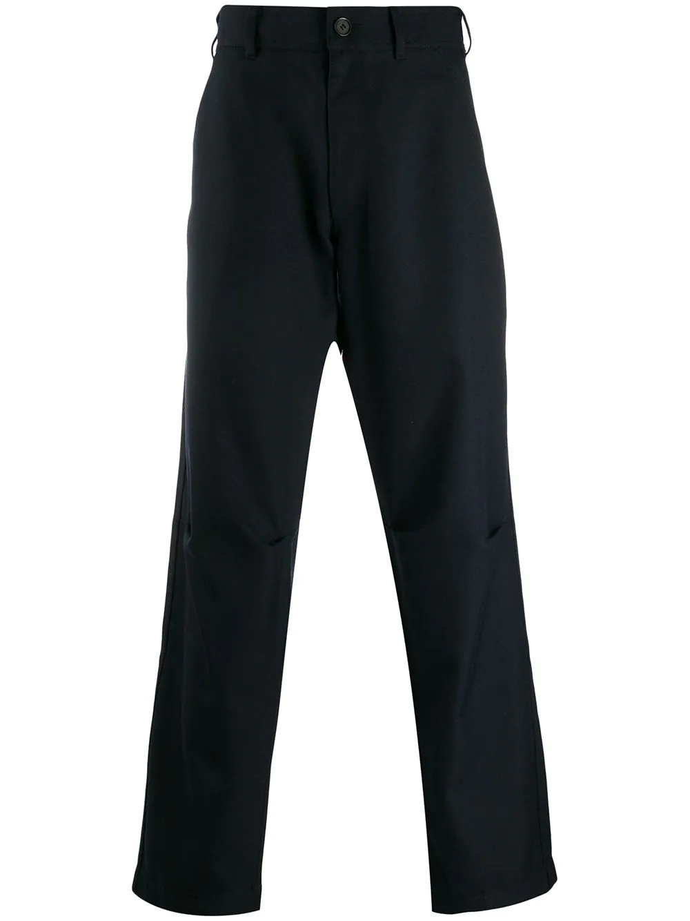cropped tailored trousers Navy blue wool blend cropped tailored trousers from Comme Des Garcons Shirt featuring a waistband with belt loops, a front button fastening, back pockets and a loose fit. Made in France Composition Polyester 55%, Wool 45% SIZE & FIT Model measurements Height 6 ft 1 in(1.85 m) Bust/Chest 35.82 in(91 cm) Hips 37.79 in(96 cm) Waist 29.13 in(74 cm) FittingInformation This piece fits true to size. We recommend you get your regular size Cut for a relaxed fit Made with a mid-weight non-stretch fabric Washing instructions Dry Clean Only