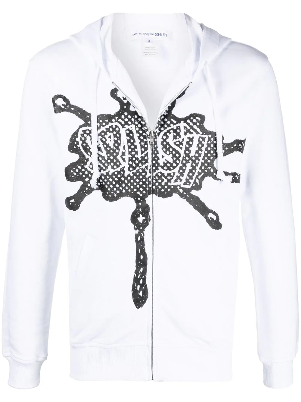 graphic-print drawstring hoodie white/black cotton graphic print to the front drawstring hood front zip fastening long sleeves ribbed cuffs ribbed hem two side slit pockets Imported Composition Cotton 100% SIZE & FIT Model measurements Height 6 ft 2 in(1.89 m) Bust/Chest 36.22 in(92 cm) Hips 35.82 in(91 cm) Waist 28.74 in(73 cm) FittingInformation This piece fits true to size. We recommend you get your regular size Cut for a relaxed fit Made with a mid-weight fabric Washing instructions Machine Wash