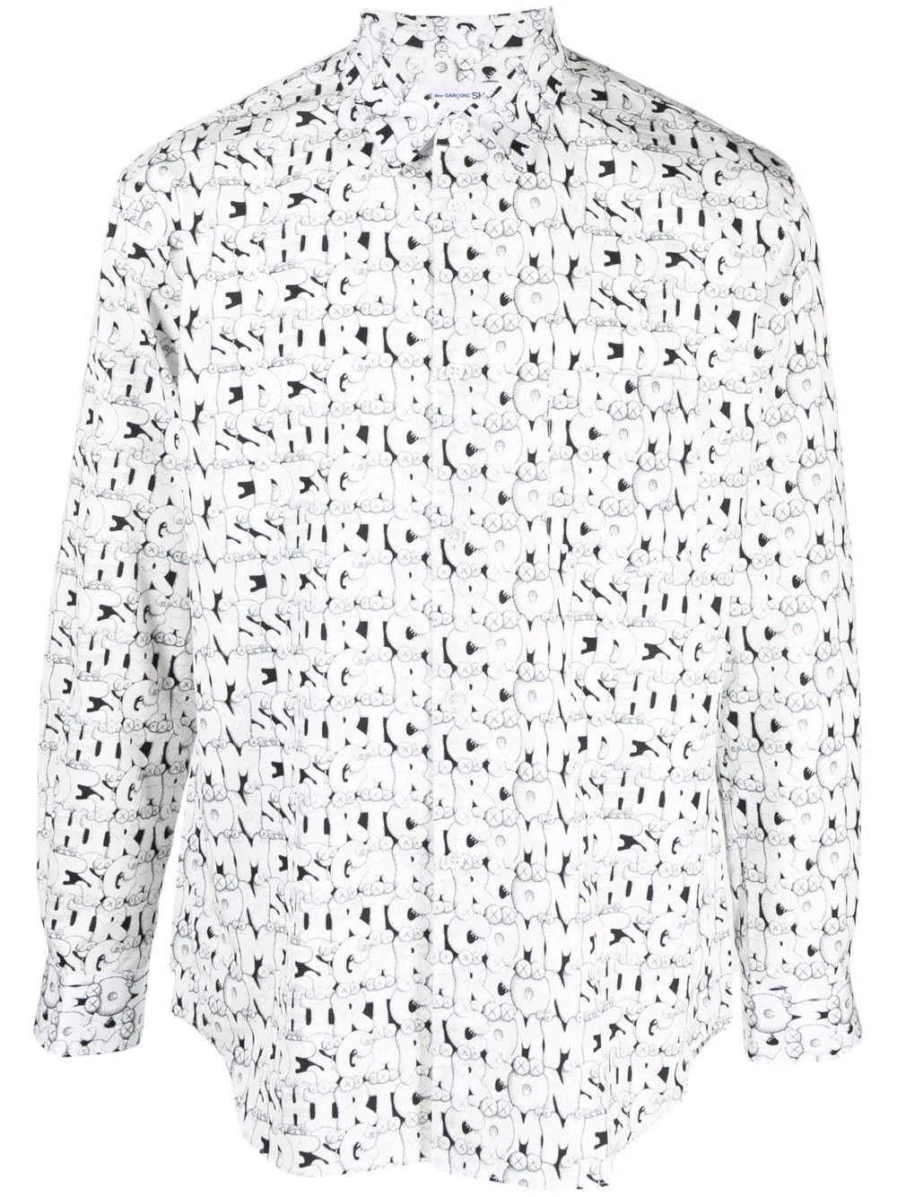 Kaws-print shirt white cotton all-over graphic print chest patch pocket classic collar front button fastening long sleeves Made in France Composition Cotton 100% SIZE & FIT Model measurements Height 6 ft 1 in(1.85 m) Bust/Chest 38.58 in(98 cm) Hips 37 in(94 cm) Waist 30.31 in(77 cm) FittingInformation This piece fits true to size. We recommend you get your regular size Cut for a loose fit Made with a mid-weight non-stretch fabric