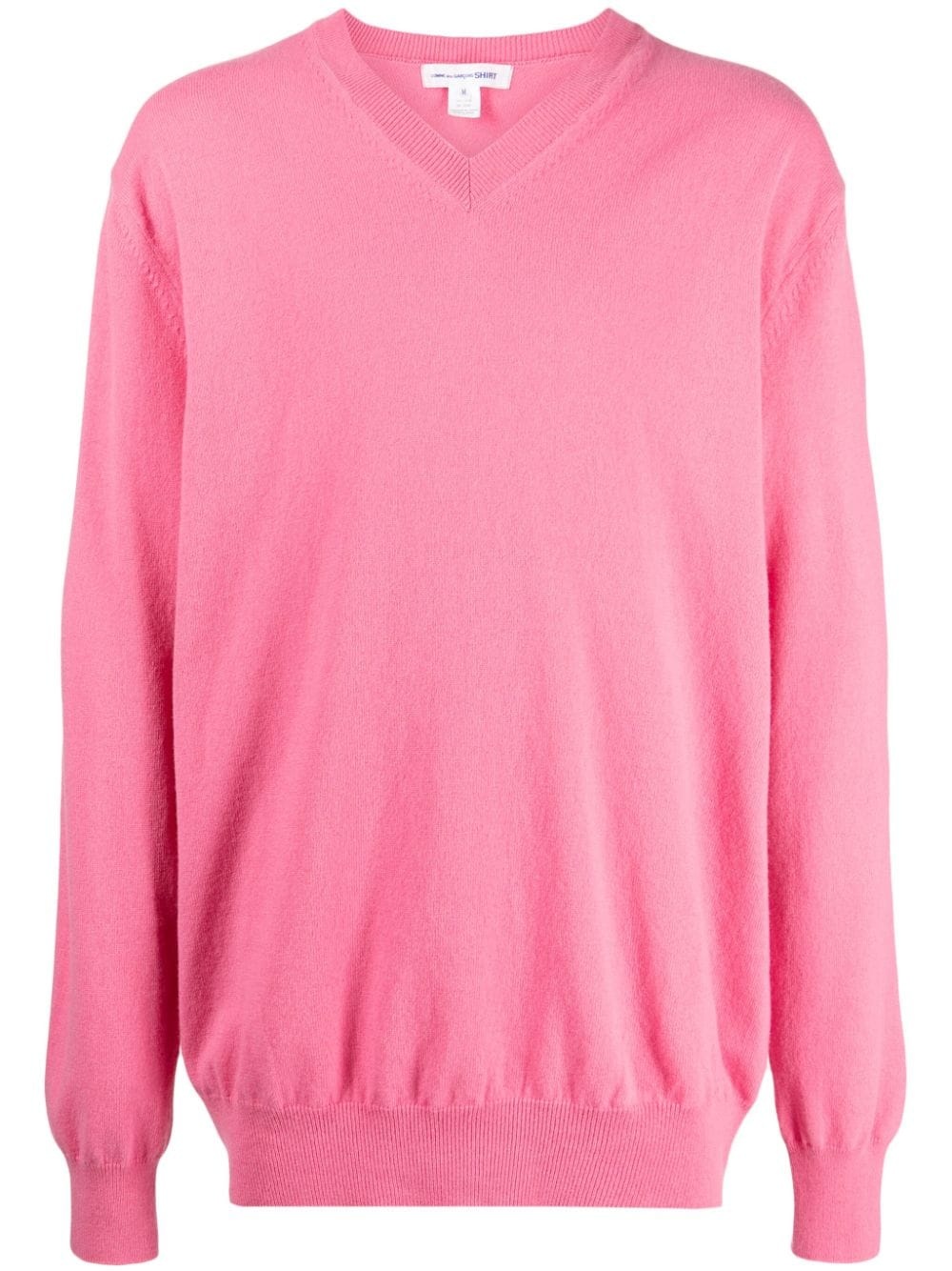 long-sleeve ribbed wool jumper Highlights - Salmon pink - Wool - Knitted construction - V-neck - Drop shoulder - Long sleeves - Ribbed knit - Straight hem Imported Composition Wool 100% SIZE & FIT Model measurements Height 6 ft 2 in(1.89 m) Bust/Chest 37.4 in(95 cm) Hips 36.61 in(93 cm) Waist 28.34 in(72 cm) Washing instructions Dry Clean Only