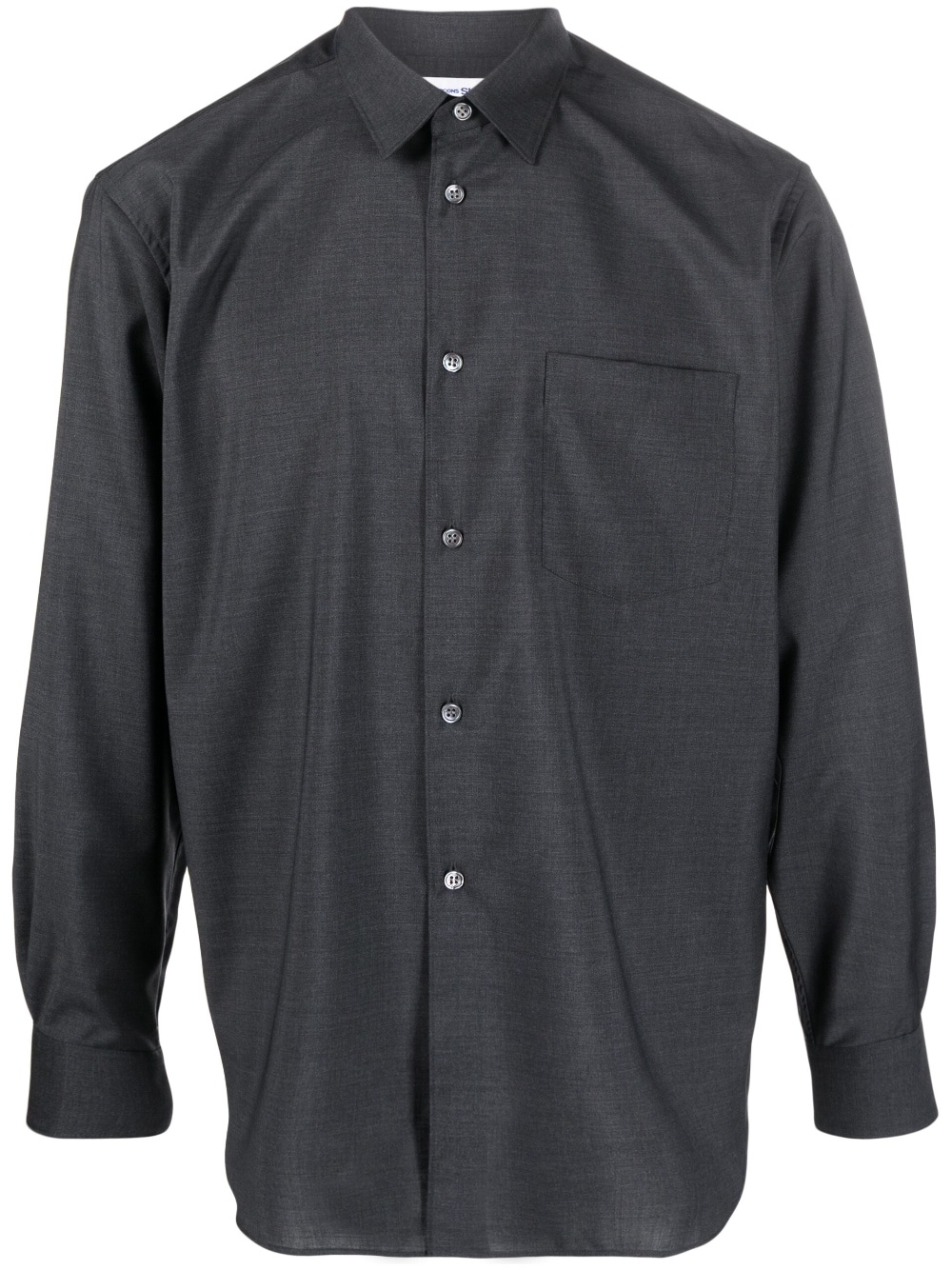 long-sleeve wool shirt dark grey wool classic collar front button fastening long sleeves curved hem Made in France Composition Wool 100% SIZE & FIT Model measurements Height 6 ft 2 in(1.87 m) Bust/Chest 36.41 in(92.5 cm) Hips 37 in(94 cm) Waist 29.52 in(75 cm) FittingInformation Designed to be unstructured, offering a loose fit throughout Made from a midweight non-stretch fabric This piece fits true to size – take your usual size Washing instructions Dry Clean Only