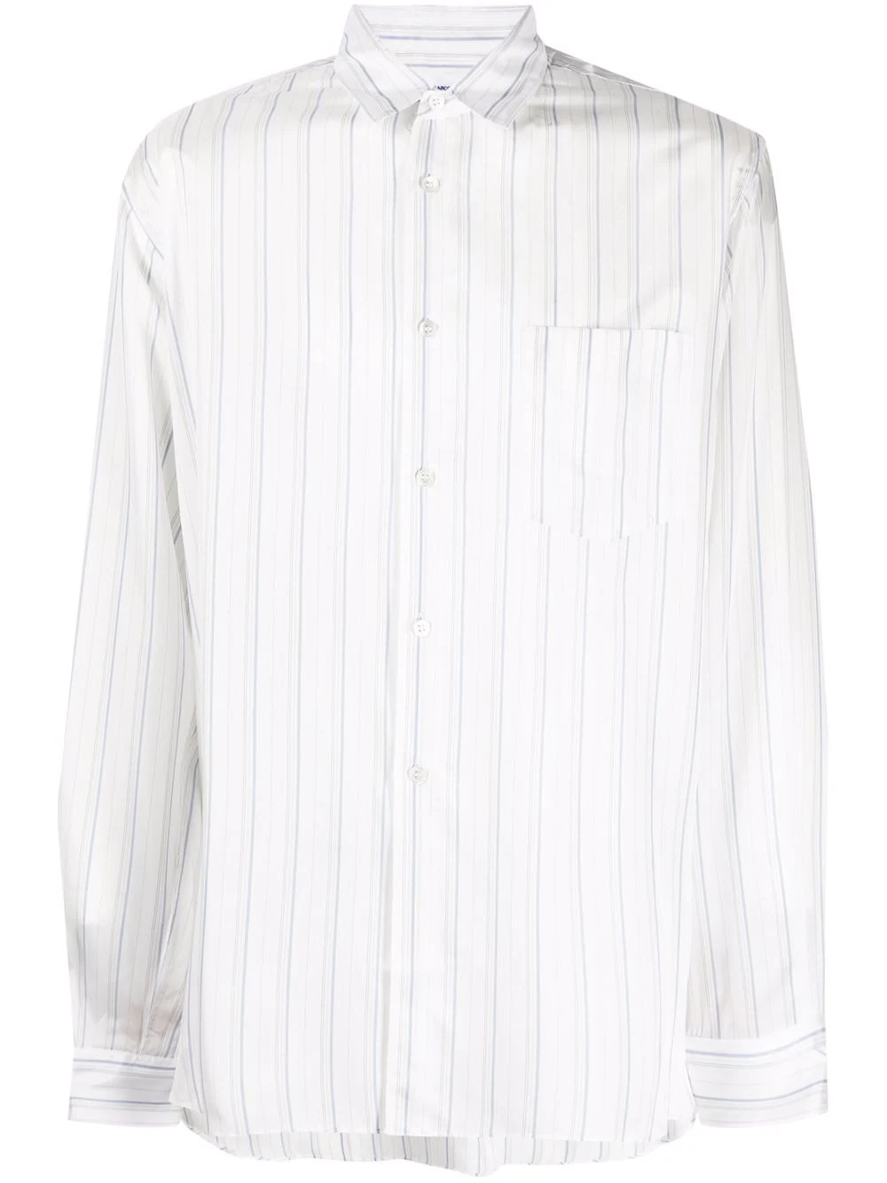 vertical stripe-print shirt white/light blue straight-point collar front button fastening long sleeves buttoned cuffs chest patch pocket curved hem Made in France Composition Cupro 100% SIZE & FIT Model measurements Height 6 ft 2 in(1.88 m) Bust/Chest 36.61 in(93 cm) Hips 35.82 in(91 cm) Waist 27.95 in(71 cm) Measurement CHEST 40.94 in(104 cm) SLEEVE LENGTH 23.62 in(60 cm) LENGTH 29.92 in(76 cm) WAIST 37.79 in(96 cm) Shoulder Width 18.5 in(47 cm) FittingInformation This piece fits true to size. We recommend you get your regular size Cut for a loose fit Made with a lightweight non-stretch fabric Washing instructions Dry Clean Only