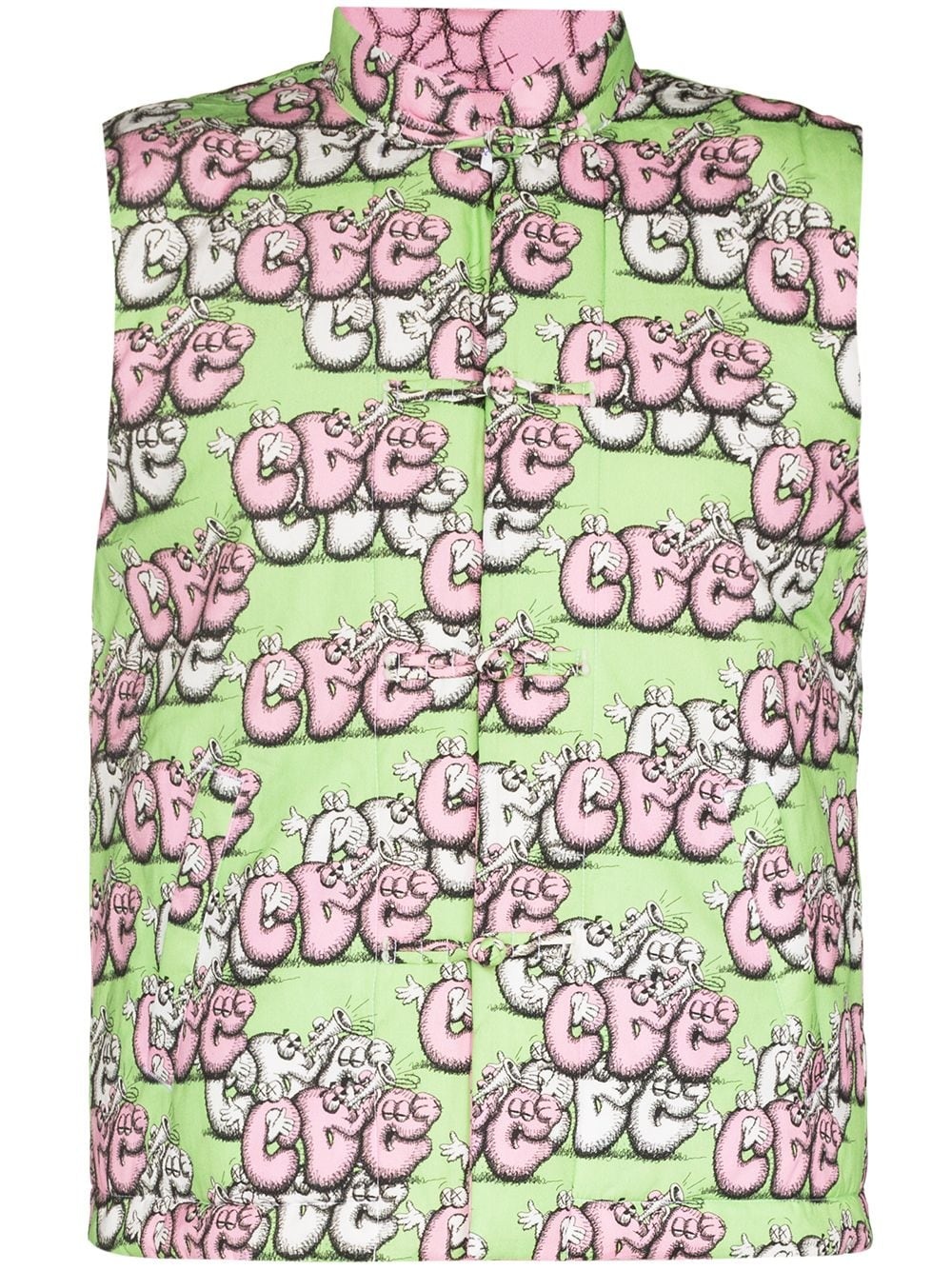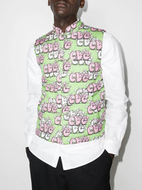 x KAWS cartoon logo gilet Comme Des Garcons Shirt and KAWS collaborate to create a collection filled with graphic details. Here, the brands transform the classic silhouette of a padded gilet with a signature KAWS print. Made in France Composition Cotton 100% SIZE & FIT Model measurements Height 6 ft 2 in(1.87 m) Bust/Chest 36.41 in(92.5 cm) Hips 37 in(94 cm) Waist 29.52 in(75 cm) Measurement CHEST 37.4 in(95 cm) LENGTH 21.25 in(54 cm) Shoulder Width 14.17 in(36 cm) FittingInformation This piece fits true to size. We recommend you get your regular size Cut for a loose fit Made with a mid-weight non-stretch fabric Washing instructions Dry Clean Only