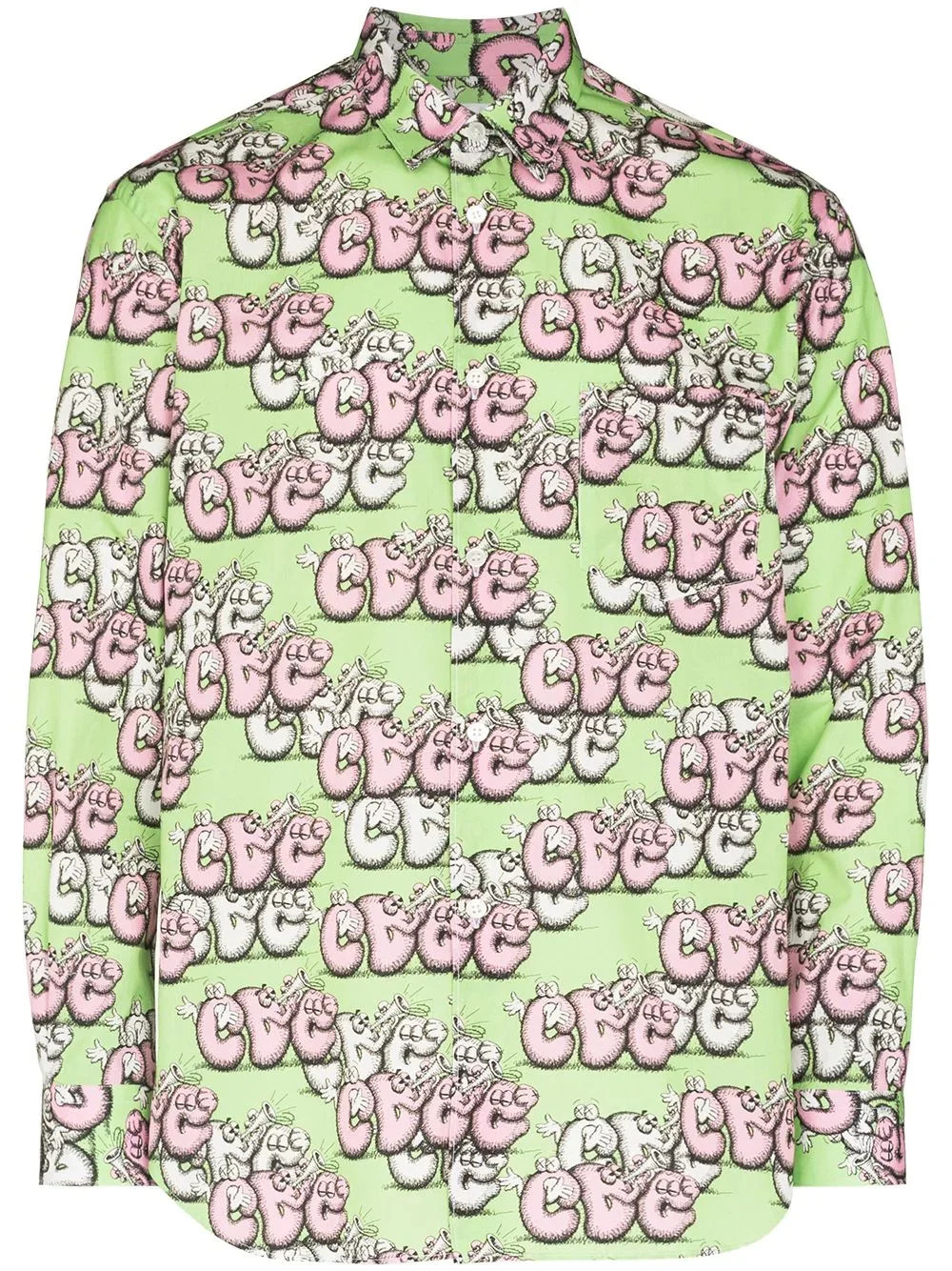 x KAWS graphic-print shirt Comme Des Garcons Shirt and KAWS collaborate to create a collection filled with graphic details. Here, the brands transform the classic silhouette of a tailored shirt with a signature KAWS print. Made in France Composition Cotton 100% SIZE & FIT Model measurements Height 6 ft 2 in(1.87 m) Bust/Chest 36.41 in(92.5 cm) Hips 37 in(94 cm) Waist 29.52 in(75 cm) Washing instructions Machine Wash