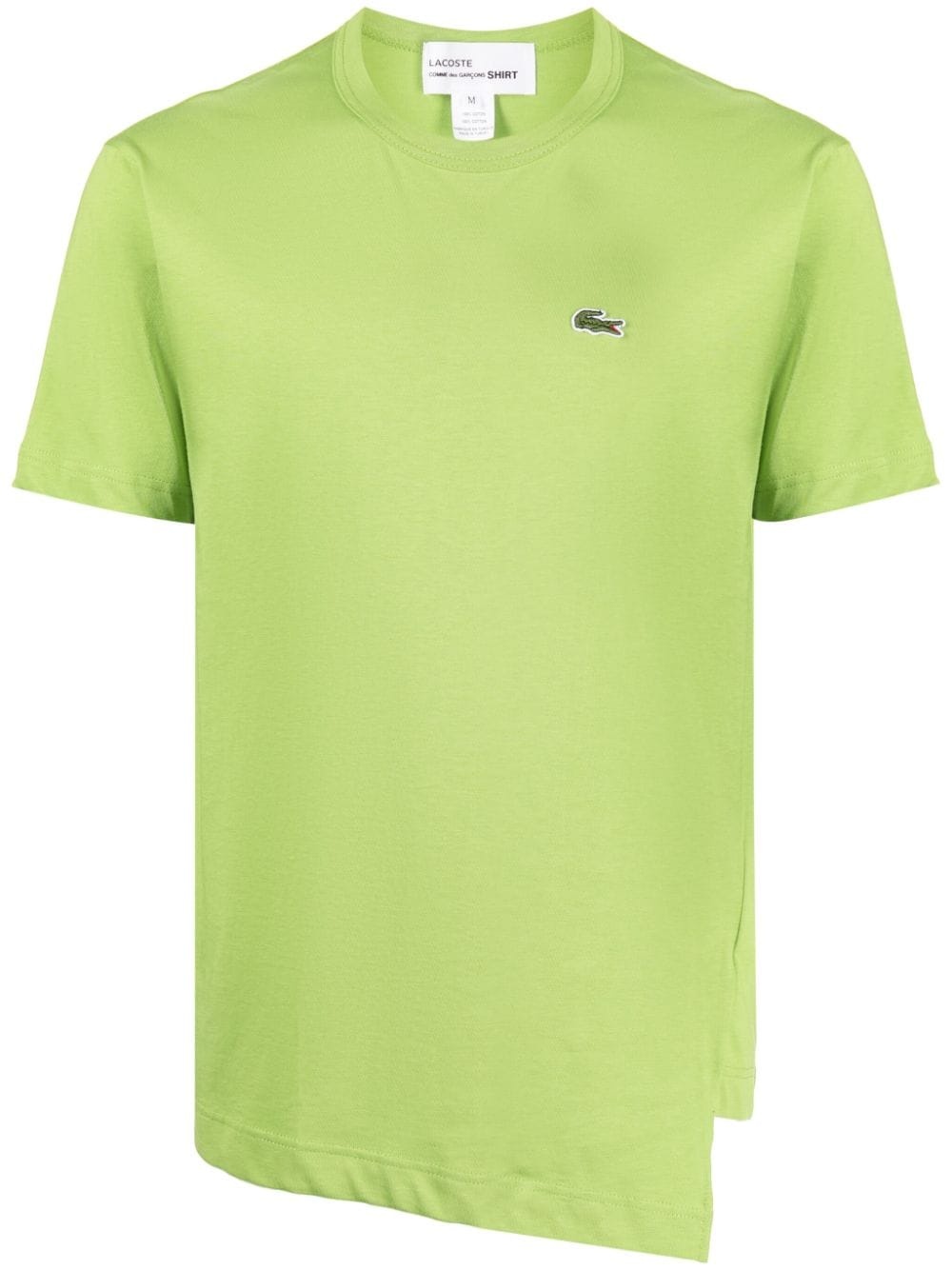 x Lacoste asymmetric T-shirt Joining Comme Des Garcons's avant-garde style with Lacoste's sporty touch, this lime green T-shirt features a straight and relaxed cut with an asymmetric hem. Crafted from cotton, the piece is elevated with a signature crocodile motif at the chest. Highlights - Lime green - Cotton - Embroidered logo at the chest - Crew neck - Short sleeves - Asymmetric hem Imported Composition Cotton 100% SIZE & FIT Model measurements Height 6 ft 2 in(1.89 m) Bust/Chest 37.4 in(95 cm) Hips 36.61 in(93 cm) Waist 28.34 in(72 cm) FittingInformation Designed to be unstructured, offering a loose fit throughout Made from a midweight non-stretch fabric, this piece offers minimal elasticity when worn This piece fits true to size – take your usual size