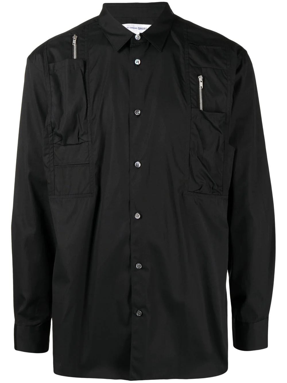 zip-pocket long-sleeve shirt black cotton classic collar front button fastening long sleeves buttoned cuffs curved hem multiple zip-fastening pockets Made in France Composition Cotton 100% SIZE & FIT Model measurements Height 6 ft 2 in(1.88 m) Bust/Chest 31.88 in(81 cm) Hips 35.82 in(91 cm) Waist 27.55 in(70 cm) FittingInformation This piece fits true to size. We recommend you get your regular size Cut for a loose fit Made with a lightweight non-stretch fabric