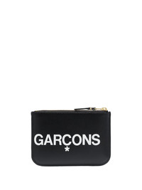 small logo-print pouch We strongly believe one should appreciate the small things in life. That's why we'll treasure this Comme Des Garcons Wallet leather pouch forever. Highlights - This black comme des garcons wallet logo leather wallet features a top zip fastening with gold tone hardware and contrasting white logo print to the front and back. black is the colour of mystery, so if - Scooby-doo - turns up, we're not letting him near our comme des garcons wallet. Imported Composition Outer: Calf Leather 100% Lining: Fabric 100% SIZE & FIT Measurement HEIGHT 3.93 in(10 cm) WIDTH 5.9 in(15 cm)