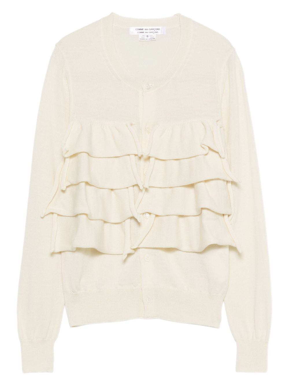 tiered-ruffle cardigan Highlights - Off-white - Layered ruffles - Button front - Long sleeves - Ribbed trims Imported Composition Fabric 100% Washing instructions Read Manufacturer Guidelines